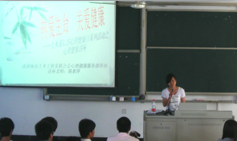 5月18日下午,土木系联合会心理健康服务部关于“热爱生命关爱健康”心理讲座在北教5#204举办。本次讲座邀请了来自校心理健康协会的骆素萍老师。出席本次讲座的有:土木系联合会理事长钟星、联合会副理事长林小军以及土木系各年级同学。