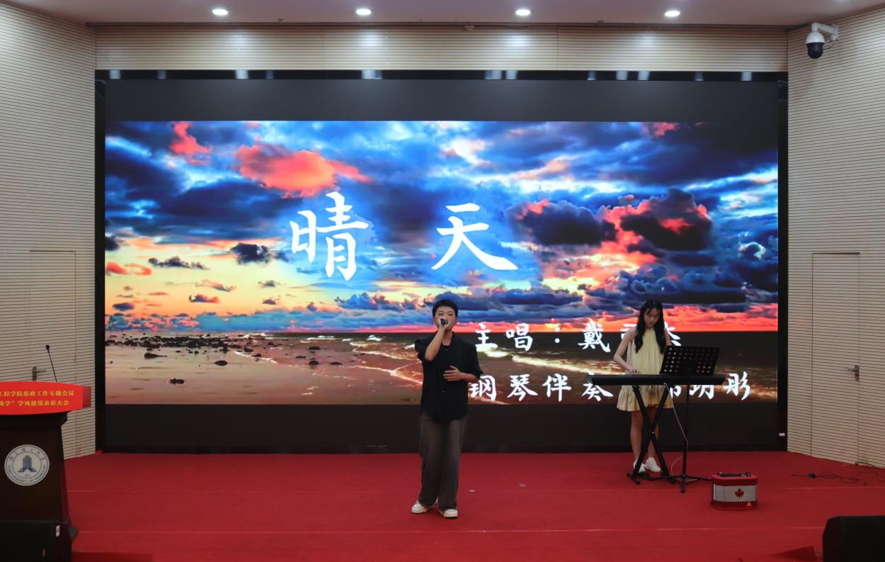 大会穿插精彩文艺表演。土木2023级江烜等同学与校民乐团带来古筝合奏《盛世民乐》,以悠扬旋律拉开文艺环节序幕;中场休息时,2023级戴司杰献唱《晴天》,青春歌声点燃全场热情。节目融合传统艺术与现代元素,既展现学院文化底蕴,又彰显青年学子的蓬勃朝气。