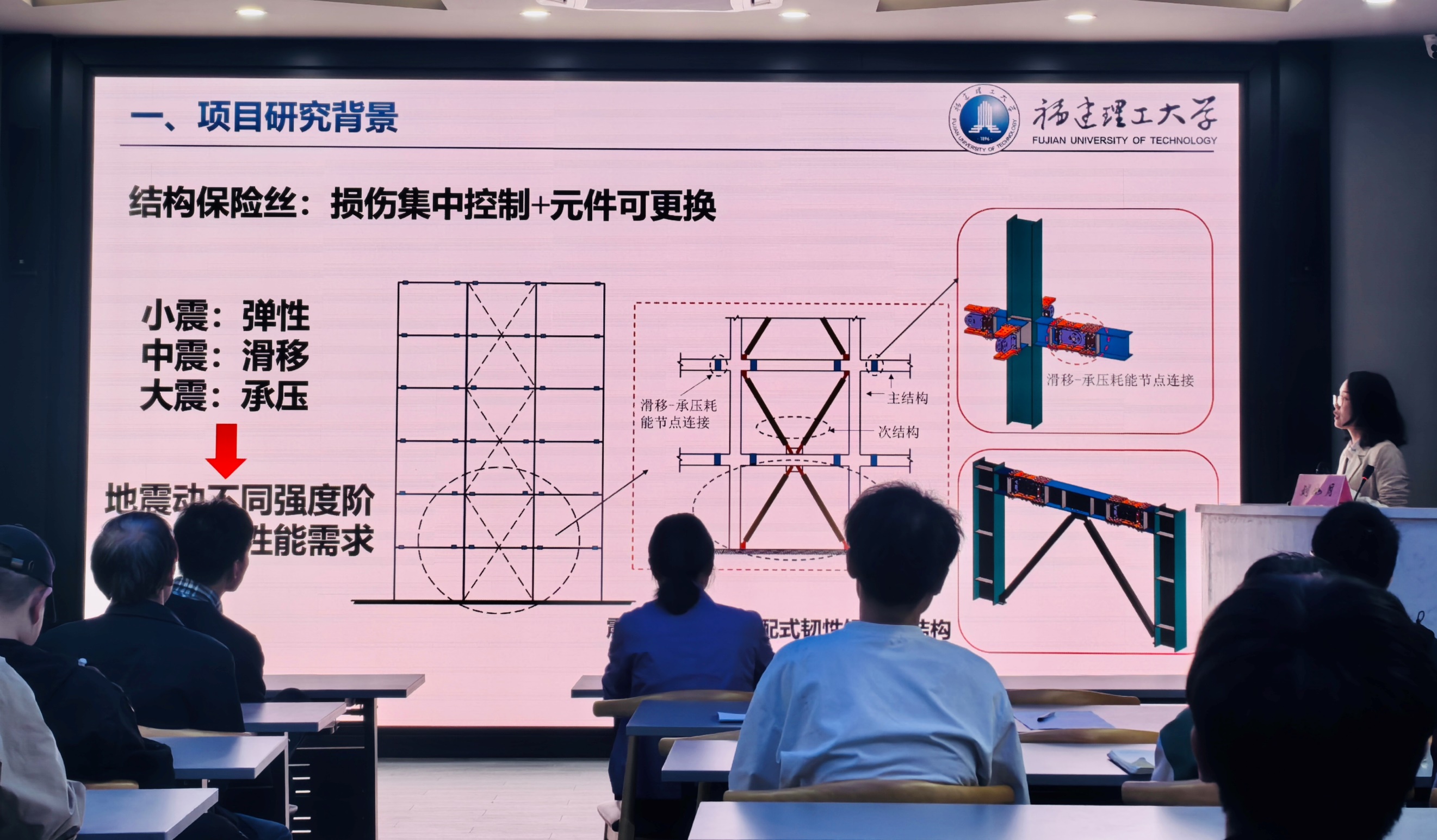刘如月老师以《摩擦-承压型耗能节点连接的装配式支撑钢框架性态演化机制及控制方法》为主题,针对装配式钢结构的损伤控制和震损可修复性,提出以摩擦-承压型耗能节点连接和防屈曲支撑作为集承载和耗能为一体的损伤元,形成一种具有较大抗侧刚度、多重耗能机制且震损可修复的延性耗能装配式钢结构体系。从局部到整体,对摩擦-承压型耗能节点连接的多阶段特征荷载-变形机制、摩擦-承压型耗能节点连接的装配式支撑钢框架的抗震性能及设计方法、摩擦-承压型耗能节点连接的装配式支撑钢框架的地震易损性等开展系列研究。形成了摩擦-承压型耗能节点连接的滞回本构模型及构建方法、基于耗能集中控制的结构塑性设计方法等系列成果,为提升装配式框架结构的抗震韧性提供理论支撑。