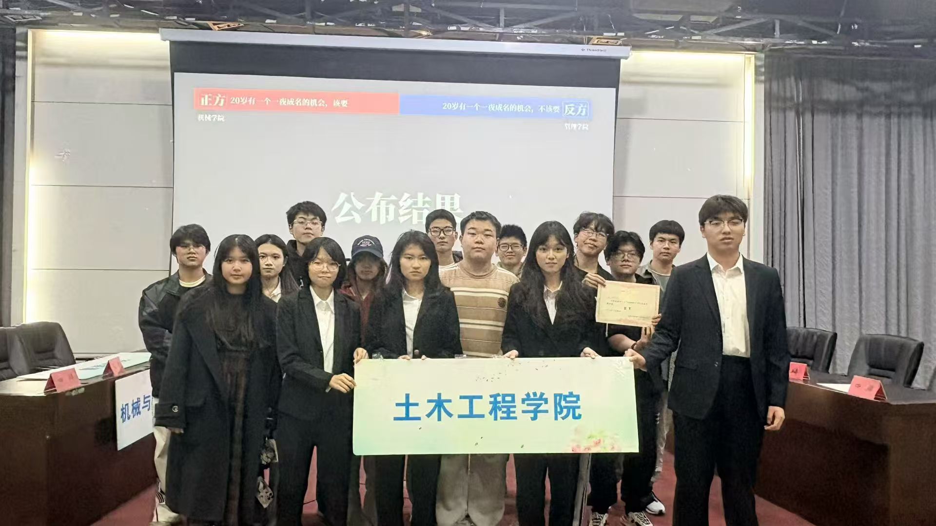 从初赛到决赛,从坚守梦想到理性抉择,土木辩论队的每一位成员都在赛场上不断突破自我。他们深夜打磨辩词,反复模拟攻防,用汗水浇灌成长,用语言传递思想。这份冠军荣誉,是团队协作的成果,更是土木学子敢于思辨、勇于拼搏的生动写照。
