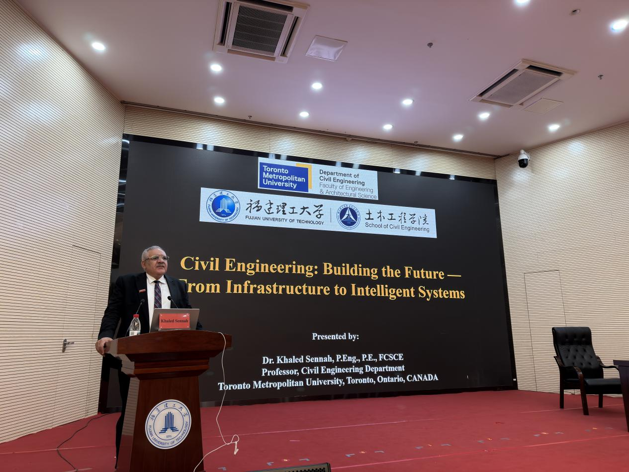 12月30日上午,土木工程学院特邀加拿大工程院院士、我校特聘教授、多伦多都会大学Khaled Sennah博士在行政楼学术报告厅,开展了题为《土木工程:构建未来——从基础设施到智能化系统》的学术讲座。国际著名拱桥专家、学校特聘教授陈宝春作为特邀嘉宾出席。学院院长王刚、党委副书记陈庆周、全体辅导员、教师代表及2025级相关专业学生一同参加。讲座由王刚院长主持。