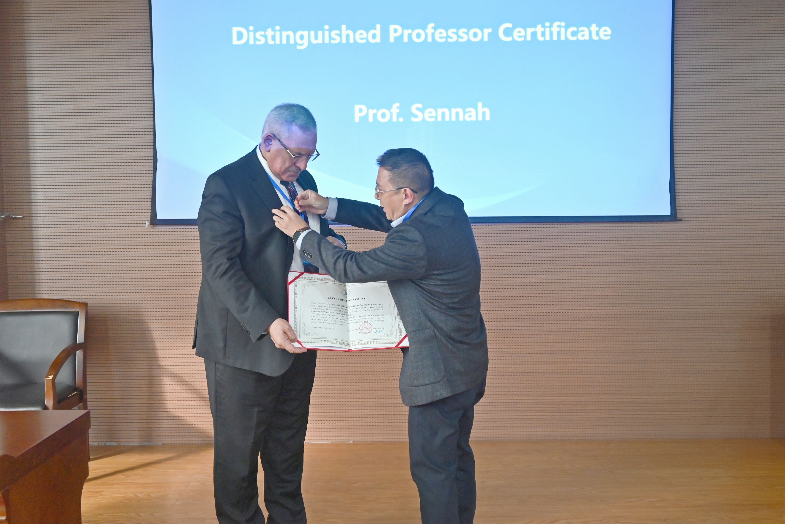 福建理工大学何校长给塞纳教授佩戴校徽、颁发聘书