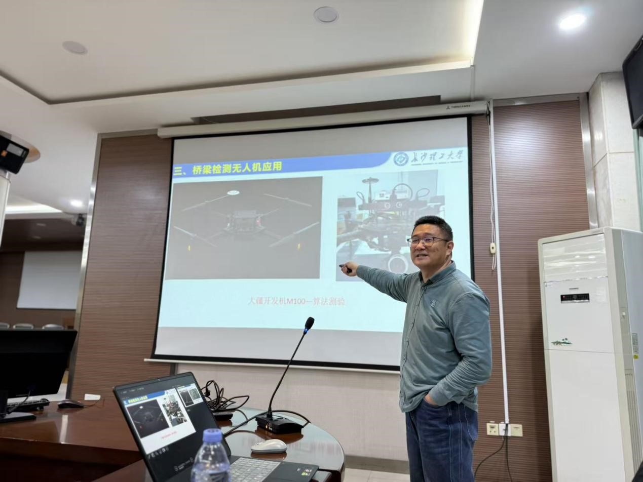 讲座伊始,谢海波博士结合自身十余年在智能检测技术研发、科研攻关及工程服务方面的深厚积淀,系统梳理了其团队在软硬件产品升级迭代中的探索历程。围绕高耸结构智能巡检、无人机自主导航关键技术攻关、桥梁图像智能处理、土木与电力结构病害智能识别与多维应用、桥梁数字孪生构建与应用等五个核心维度,向在场师生简述了有关硬件产品研制的创新历程和智能识别软件编制的基础理论。